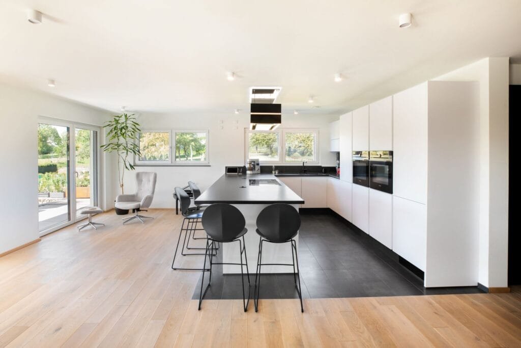 Auch die Energieeffizienz spielt eine zentrale Rolle. In Kombination mit dem Therm-Living-Konzept von Fingerhut Haus entsteht eine Gebäudehülle, die Wärmeverluste minimiert und zugleich ein angenehmes Raumklima schafft. Hochwertige Dämmstoffe, diffusionsoffene Holzweichfaser-Verbundsysteme und geprüfte heimische Hölzer bilden dabei die Grundlage.