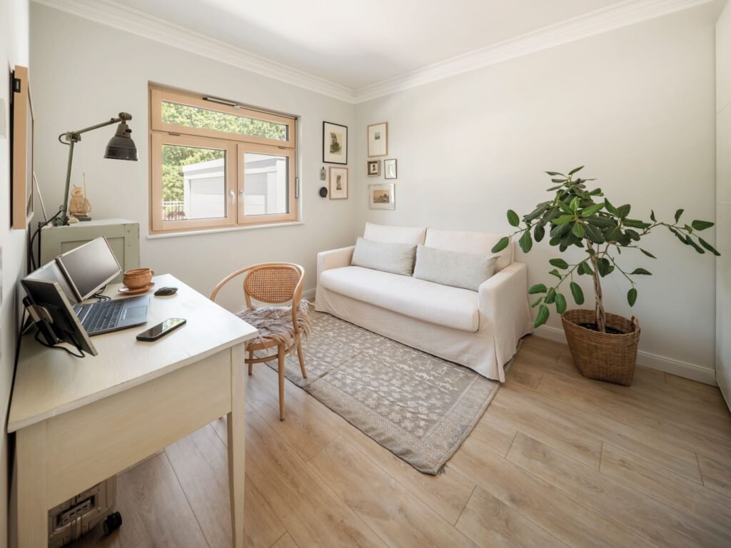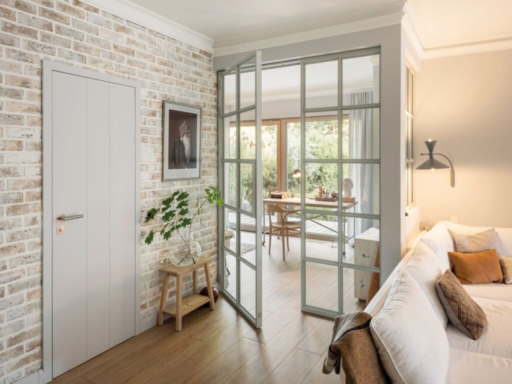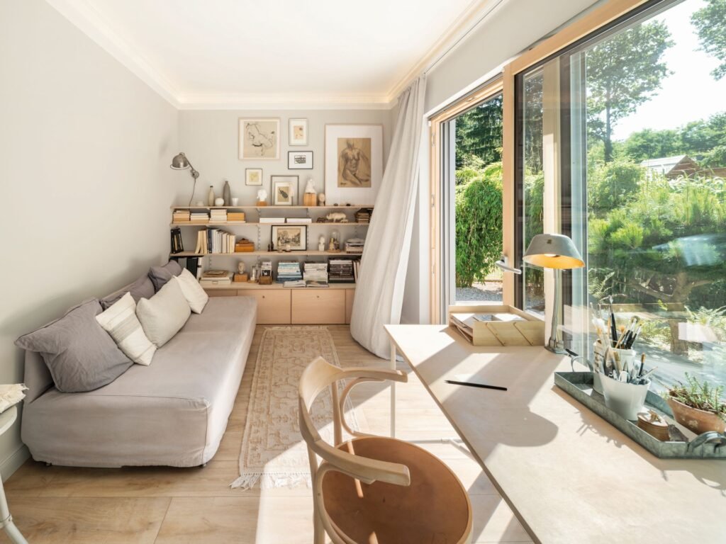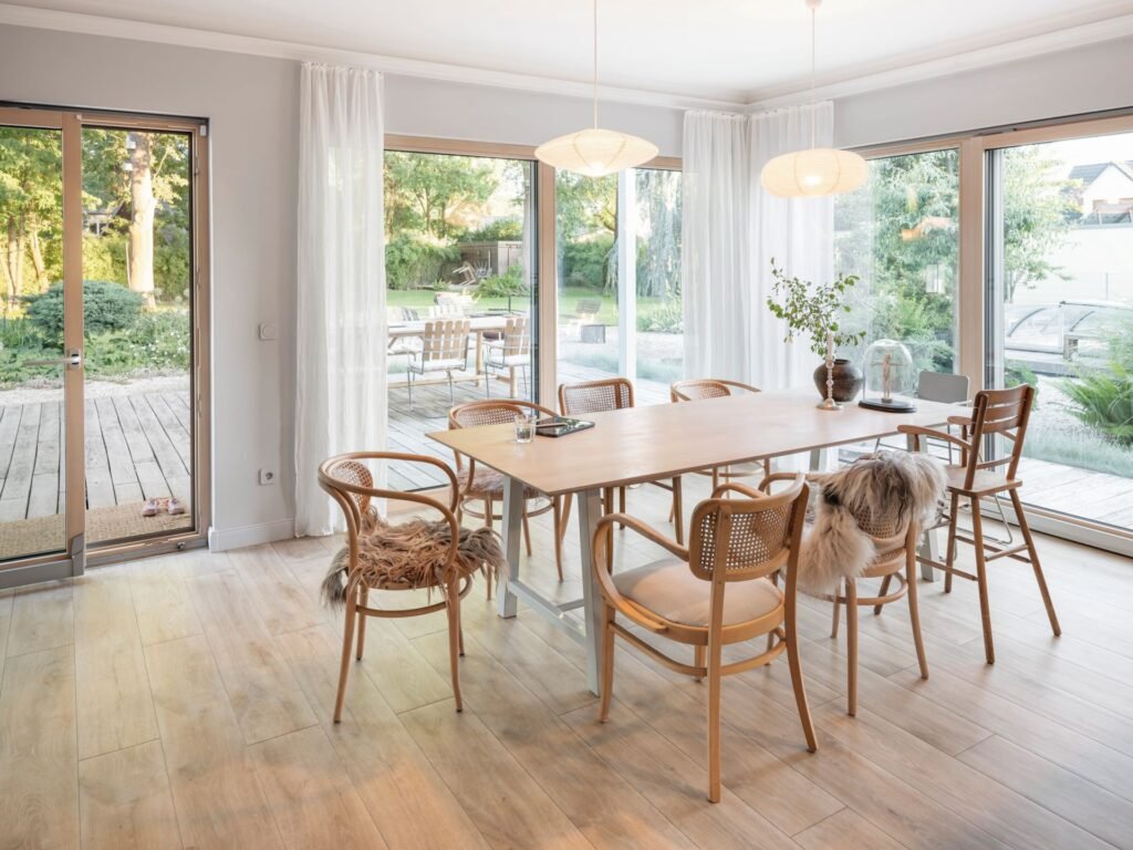 Dank dieses grünen Paradieses können Ilka und Lutz sich ein weiteres großes Bungalow-Plus optimal erschließen: Die Wohnräume des Hauses mit einer direkten optischen und physischen Verbindung zur Natur auszustatten. Bodentiefe Fenster und Fenstertüren öffnen die Wohnräume zu Garten und Terrassen, beziehen diese ins Wohnen mit ein und lassen so selbst kleinere Zimmer, wie Ilkas Arbeitszimmer, größer erscheinen.