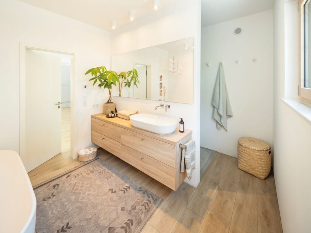 Ergänzt wird der zentrale Raum des Bungalows durch das Schlaf- und Badezimmer von Lutz und Ilka. Das Bad statteten sie mit einer Walk-in-Dusche sowie einer Badewanne aus. Jeder der beiden legte außerdem Wert auf ein eigenes Arbeitszimmer, das bei Bedarf groß genug ist, um auch als Gästezimmer zu fungieren. Dazu wünschten sie sich natürlich ein Gästebad mit Dusche. Weil Ilka und Lutz bei der Planung auch das barrierearme Wohnen im Alter im Blick hatten, beschlossen sie auf einen Keller zu verzichten: Auch die Nebenräume sollten im Alltag ebenerdig zu erreichen sein. Deswegen befindet sich auch ein Hauswirtschafts- und Haustechnikraum im Erdgeschoss.