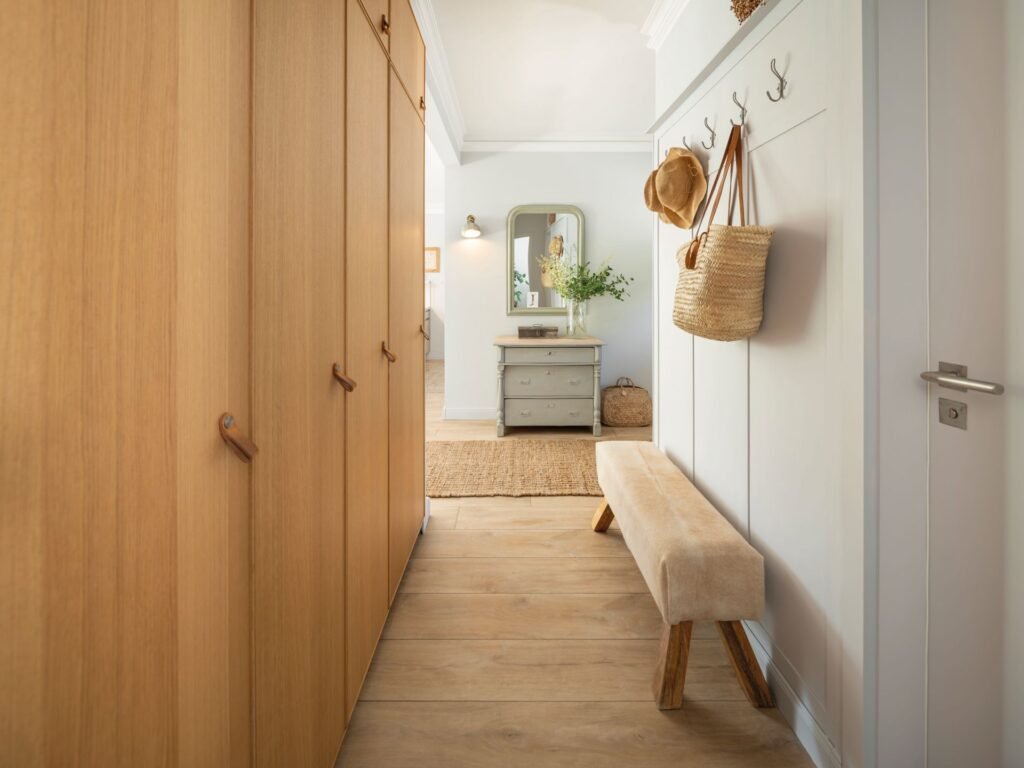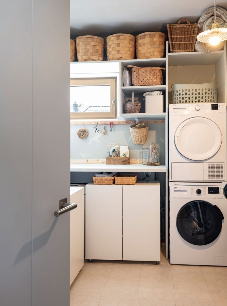 Ilka und Lutz verzichteten bewusst auf eine Unterkellerung ihres Bungalows, weil es ihnen mit Blick aufs Alter wichtig war, auch Stauraum und Haustechnik ebenerdig erreichen zu können. Stauraum schafften sie innerhalb des Hauses vor allem durch Einbauschränke. Wie zum Beispiel in der Garderobe oder im Schlafzimmer. Der Hauswirtschaftsraum, bietet neben Raum für Waschmaschine und Trockner auch ausreichend Platz für die umfangreiche Haustechnik.