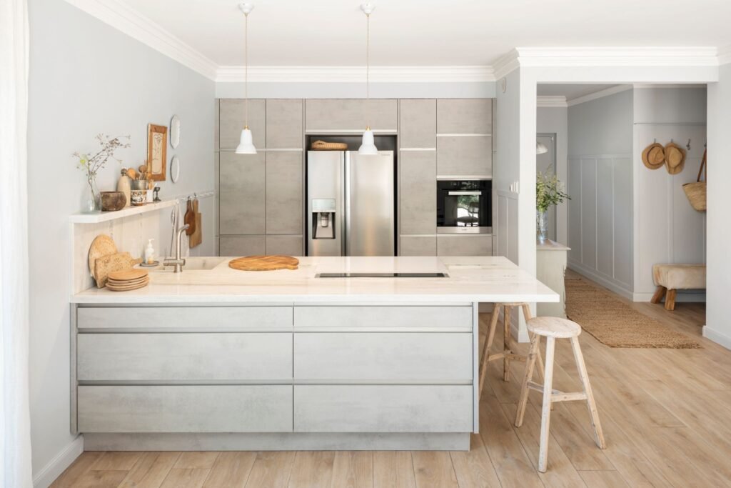 Apropos Zukunft: Was außer im Hauswirtschaftsraum in diesem Bungalow völlig unsichtbar ist, ist die Haustechnik. Dabei handelt es sich um ein extrem energieeffizientes Haus mit minimalem Heizwärmebedarf. Dafür sorgt unter anderem die überdurchschnittlich gute Dämmung der modernen Holzfertigbauweise des Bungalows. Diese sorgt auch für ein angenehmes Raumklima. Sollte das Hausinnere in den Sommermonaten aufgrund einer sehr langen Hitzeperiode doch einmal zu warm werden, sorgt die Kombination aus Luft-Wasser-Wärmepumpe mit Kühlfunktion und Fußbodenheizung und die leicht gekühlte Frischluft der Lüftungsanlage für Erleichterung.