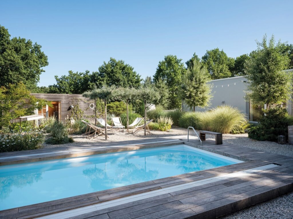 Die Platzierung des rechteckigen Bungalows parallel zur Straße sorgt für Privatsphäre. Der große Garten ist praktisch uneinsehbar. Eine entsprechende Bepflanzung trägt das ihre dazu bei. Als Ilka und Lutz westlich ihres Bungalows einen Pool bauten, ergänzten sie diesen Richtung Straße durch einen mit Holz verkleideten Carport, um auch mit seiner Hilfe neugierige Blicke auf das Treiben am Schwimmbecken abzuschirmen.