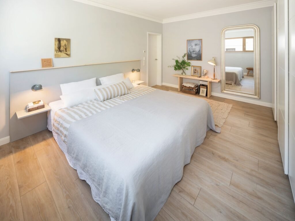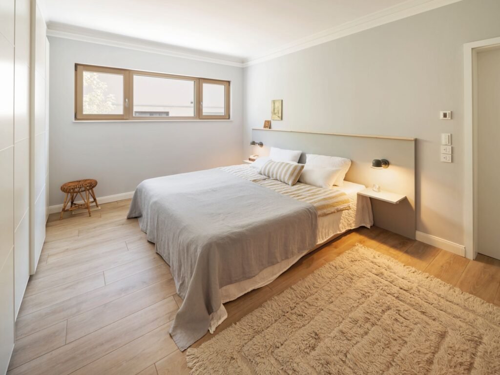 Doch nicht an jeder Stelle befand das Ehepaar die Öffnung eines Raumes durch große Fensterflächen tatsächlich als sinnvoll. Weil sie wussten, dass auf dem Nachbargrundstück noch ein Haus gebaut werden würde, entschieden sie sich zum Beispiel im Schlafzimmer für Fenster mit einer extra hohen Brüstung. So fällt Licht in das gemütliche Zimmer – ohne dass man um seine Privatsphäre fürchten muss. Denselben „Trick“ wandten sie in ihrem Badezimmer an, das direkt neben dem Schlafzimmer liegt. Auch im Gästezimmer und -bad, deren Fenster sich beide zur Einfahrt öffnen, passten die Bauherren die Fensterformate an: so wird der Tageslichtbedarf gedeckt, aber die Privatsphäre gewahrt.
