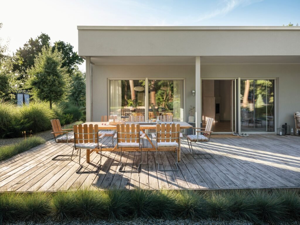 Besonders profitiert von fast geschosshohen Fenstern der Mittelpunkt des Haues, der große Wohn- und Essbereich. Drei große Hebe-Schiebetüren-Kombinationen führen von hier aus auf die an dieser Stelle ums Haus laufende, 90 Quadratmeter große Holzterrasse. Diese bietet ganz unterschiedliche Sitzgelegenheiten: Vor dem Indoor-Essbereich befindet sich das Outdoor-Esszimmer, vor dem Wohnbereich im Hausinneren eine gemütliche Loungeecke draußen.