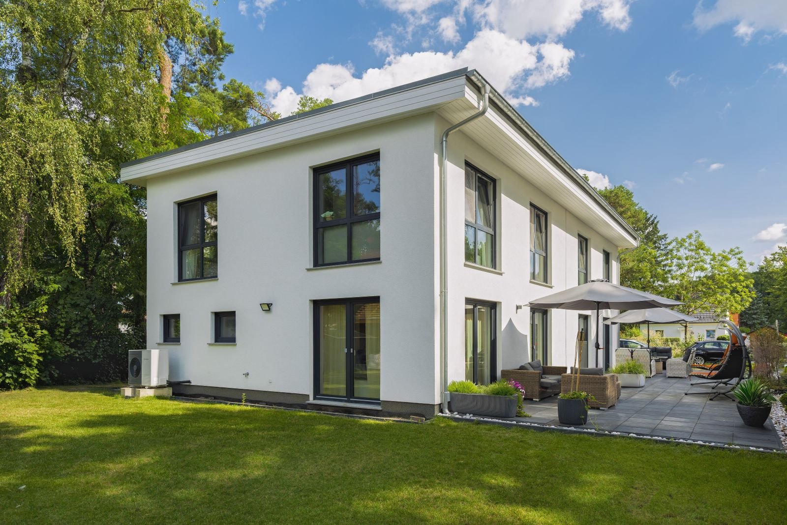 2019 wurde das Berliner Haus verkauft, und die Suche konnte beginnen. Ein glücklicher Zufall führte die Familie schließlich nach Blankenfelde-Mahlow. Bei einem Besuch der jungen Mutter bei ihrer früheren Chefin fiel der entscheidende Hinweis auf ein rund 800 Quadratmeter großes Grundstück, nur wenige Schritte vom S-Bahnhof entfernt. Schon bei der ersten Besichtigung war klar: Hier konnte das Vorhaben Realität werden. Die Kaufentscheidung fiel schnell, die Formalitäten liefen reibungslos. Nur eine Auflage stellte den ursprünglichen Plan auf die Probe: Laut Bebauungsplan durfte nur ein Wohnhaus errichtet werden. Aus zwei einzelnen Häusern wurde daher ein Doppelhaus – ein Generationenhaus, das heute zwei Familien unter einem Dach vereint.