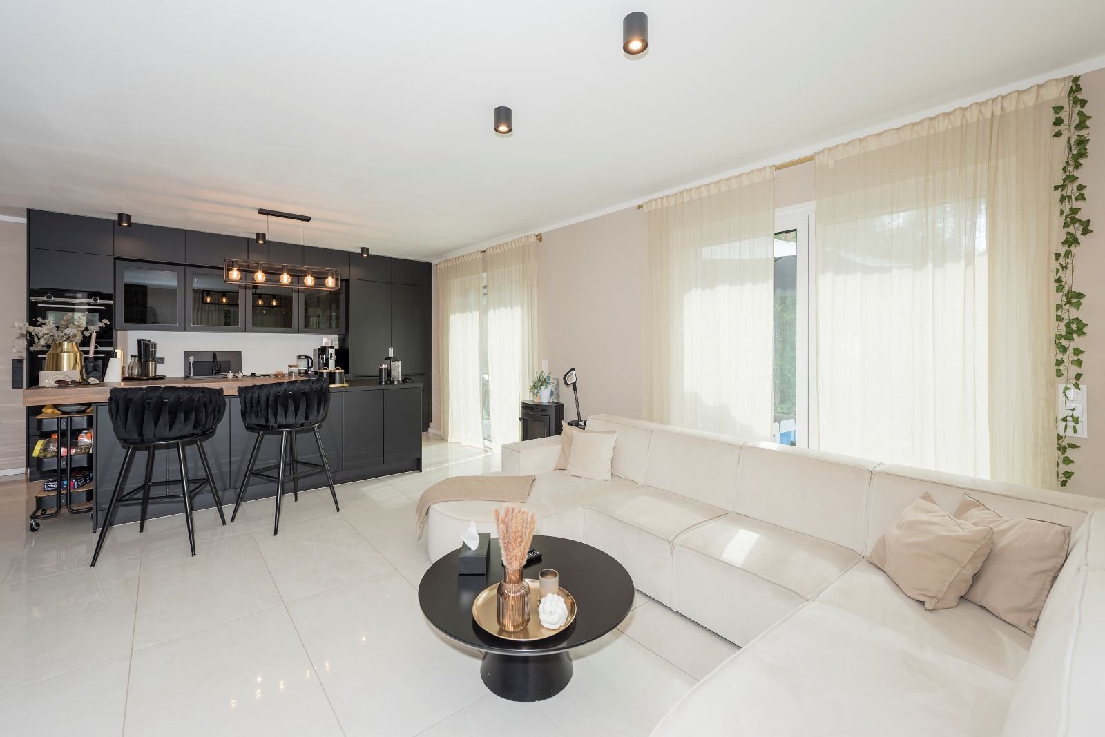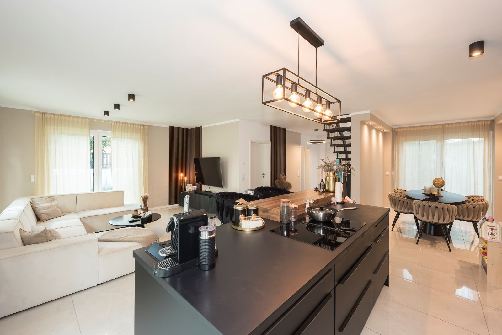 Nebenan entfaltet sich das Leben der jungen Familie. Schon der Eingangsbereich setzt mit dunkelbraunen Akzenten und moderner Ring-Leuchte einen klaren Auftakt. Die Küche mit schwarzen Fronten und Holzoberflächen öffnet sich zur Insel mit geometrischer Leuchte. Ein Essbereich mit rundem Tisch und gemütlichen Polsterstühlen geht über in einen hellen Wohnbereich mit Sofalandschaft, von dem leichte Vorhänge den Blick in den Garten freigeben.