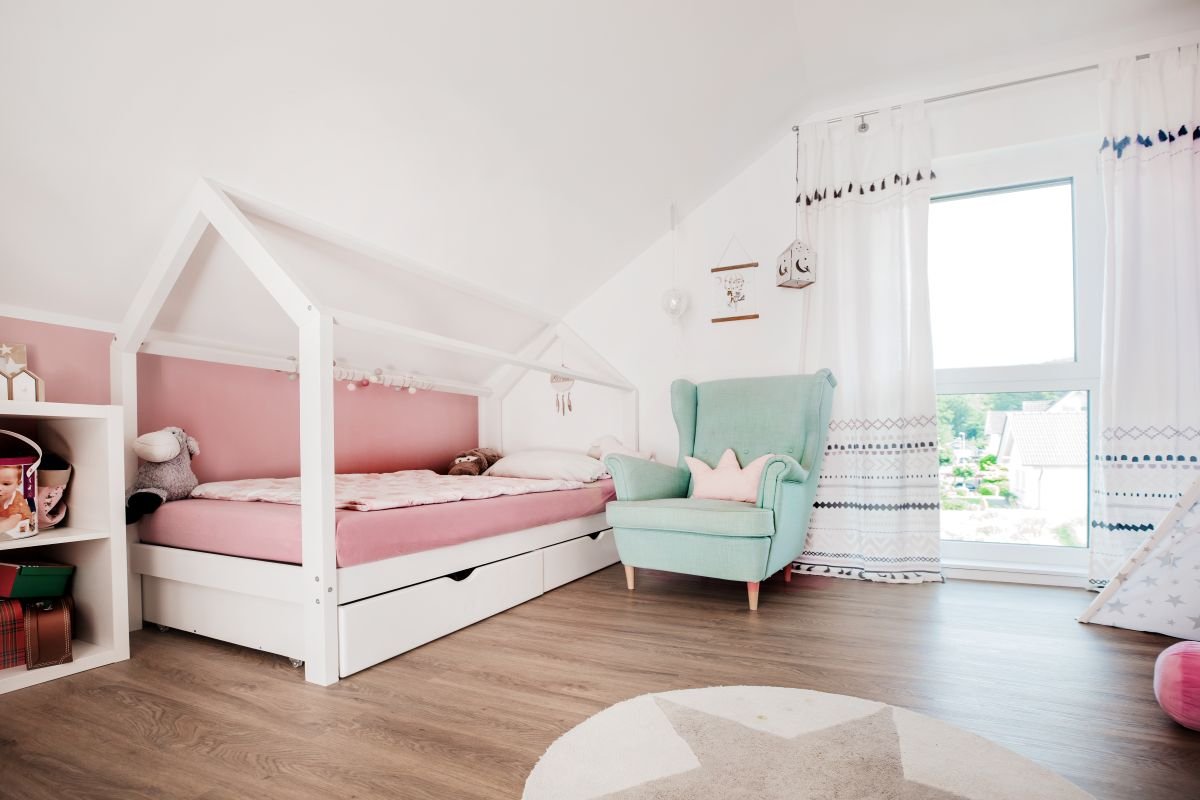 Das Herzstück des Hauses „Amika“ bildet eine große Küche, die als Treffpunkt für die ganze Familie fungiert und beispielsweise zum gemeinsamen Kochen mit den Kindern oder Gästen einlädt. Im Dachgeschoss sind Kinderzimmer mit je ca. 16-18 qm Wohnfläche entstanden. Ebenfalls gibt es hier ein Schlafzimmer, das viel Raum zur persönlichen Entfaltung und Rückzugsfläche für die Eltern bietet.