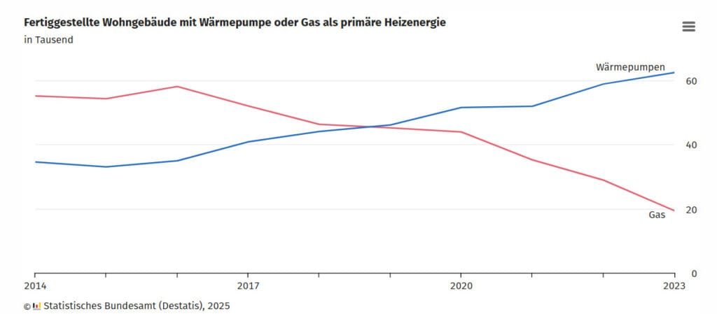 Bereits 2023 waren in 69,3 Prozent der fertiggestellten Wohngebäude erneuerbare die primäre Energiequelle für das Heizen.  Grafik: Destatis