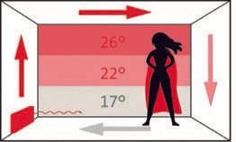 Während moderne Heizkörper eine Heizwasservorlauftemperatur von rund 55 benötigen, schaffen es Flächenheizungen, dank ihrer großen Wärmeübertragungsflächen, bereits ab 30 Grad Celsius Vorlauftemperatur Wohnräume behaglich zu temperieren. Da sie eine gleichmäßige, milde Strahlungswärme abgeben, lässt sich die Raumlufttemperatur in Räumen mit Flächenheizung im Vergleich zu einem Zimmer das mit Heizkörpern beheizt wird um etwa zwei Grad senken, dadurch ergibt sich eine Energieeinsparung von rund zwölf Prozent – ohne Behaglichkeits-Einbußen. Diese niedrige Vorlauftemperatur wiederum hilft der Wärmepumpe, in einem besonders effizienten Modus zu arbeiten und die Heizkosten so auf ein Minimum zu reduzieren. Der Nachteil von Flächenheizungen ist, dass sie relativ träge reagieren. Sie eignen sich nicht für spontane Temperaturwechsel im Haus, sondern sind ideal darauf ausgelegt, eine angenehme Temperatur dauerhaft konstant zu halten.
